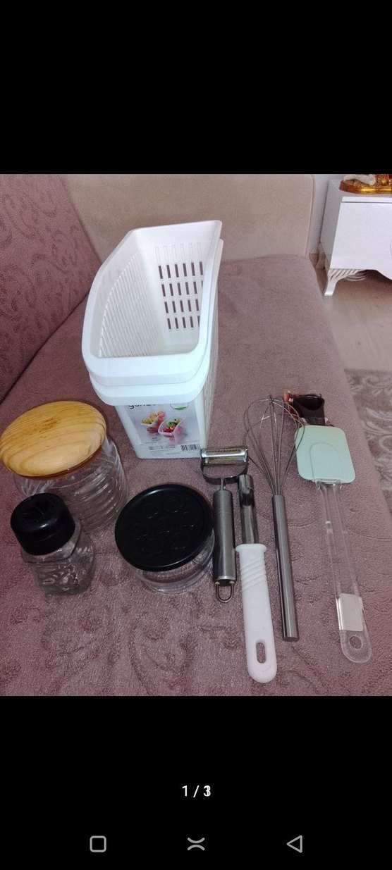Beyaz plastik süzgeç, ahşap kapaklı kavanoz, siyah kapaklı kavanoz, soyacak, çırpıcı ve silikon spatuladan oluşan mutfak gereçleri seti. Paket içerisinde ekstra malzemeler de var.resimde olmayan