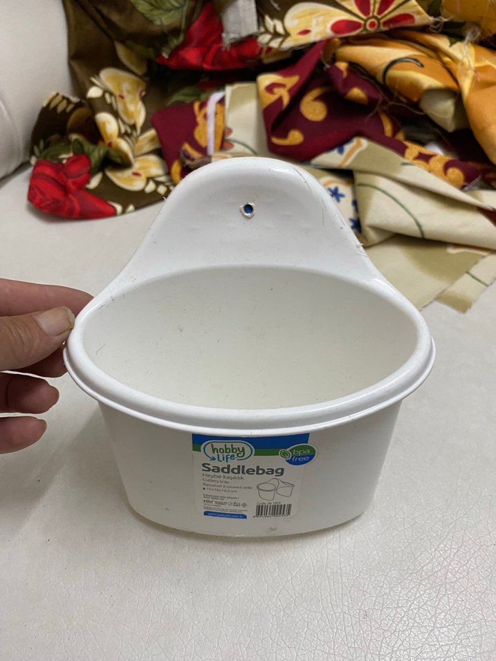 Saklama için beyaz plastik kap, üzerinde 'Saddlebag' etiketi var. Asmak için delik ve kolay temizlenen yüzeye sahip.