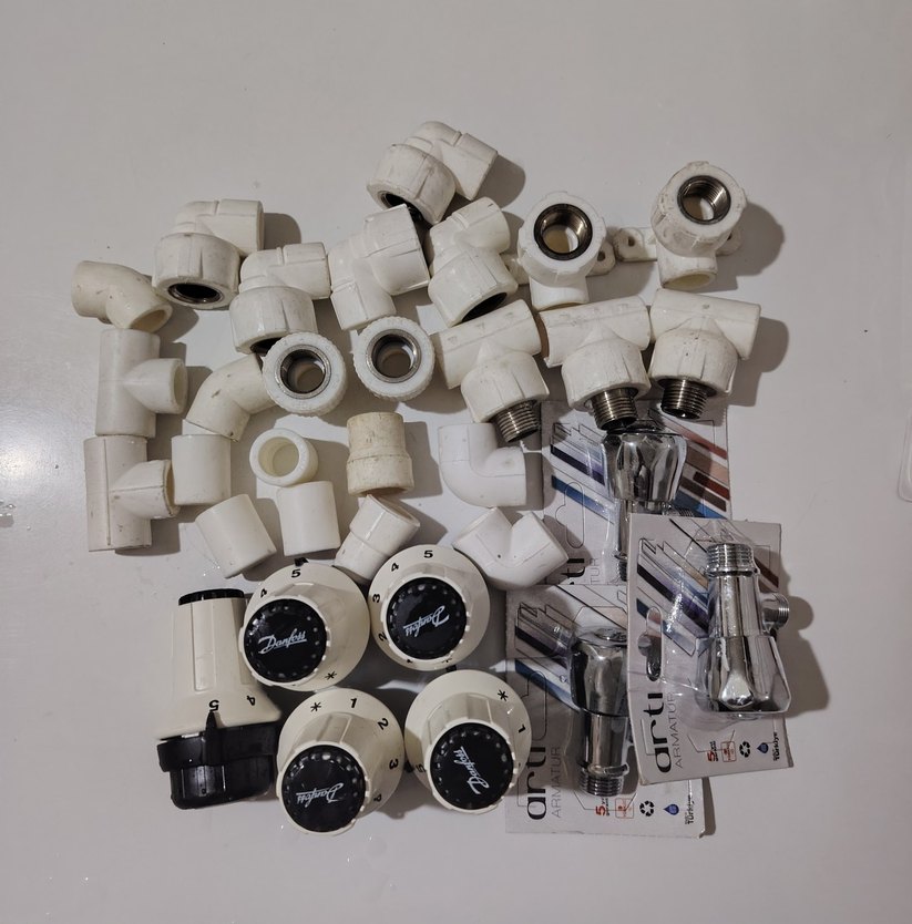 Çeşitli boru bağlantıları için beyaz plastik ve metal tesisat parçaları, vana ve bağlantı elemanları içerir. toplamda 32 parça fiyat hepsinin fiyatıdır
