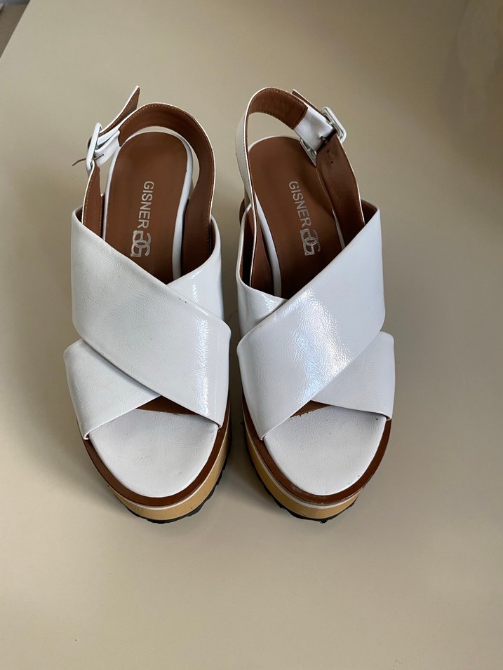 Kalın (platform) tabanlı, çapraz bantlı (cross strap) açık burunlu sandalet. Arkada ayarlanabilir toka bantlı topuk kısmı var.