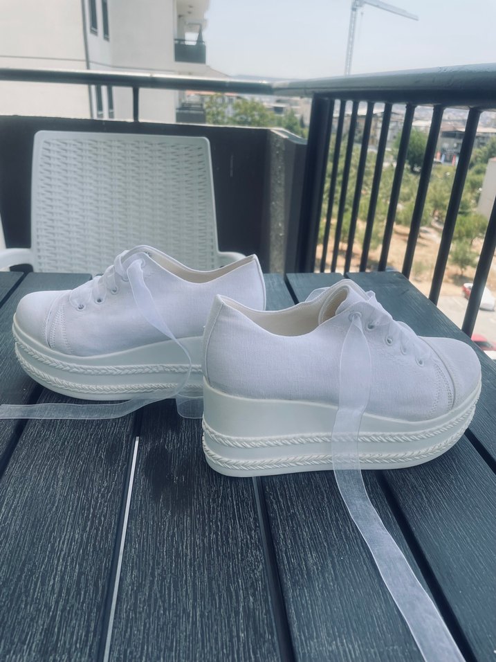Minimalist tasarımlı, beyaz platform topuklu kadın spor ayakkabısı. Kauçuk tabanlı, sokak stili ve düğün gibi rahat etkinliklere uygun.