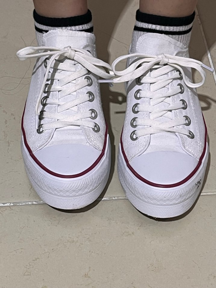 Beyaz platform topuklu, bağcıklı kadın spor ayakkabısı. Minimalist ve normcore tarzda, kauçuk malzemeden yapılmıştır. Günlük kullanım için uygundur.