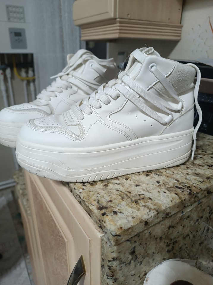 Beyaz platform topuklu, bağcıklı ve kauçuk malzemeden yapılmış kadın spor ayakkabısı. Sokak stili ve rahat spor kombinler için uygundur. Hafif ve desensiz yapıya sahiptir.