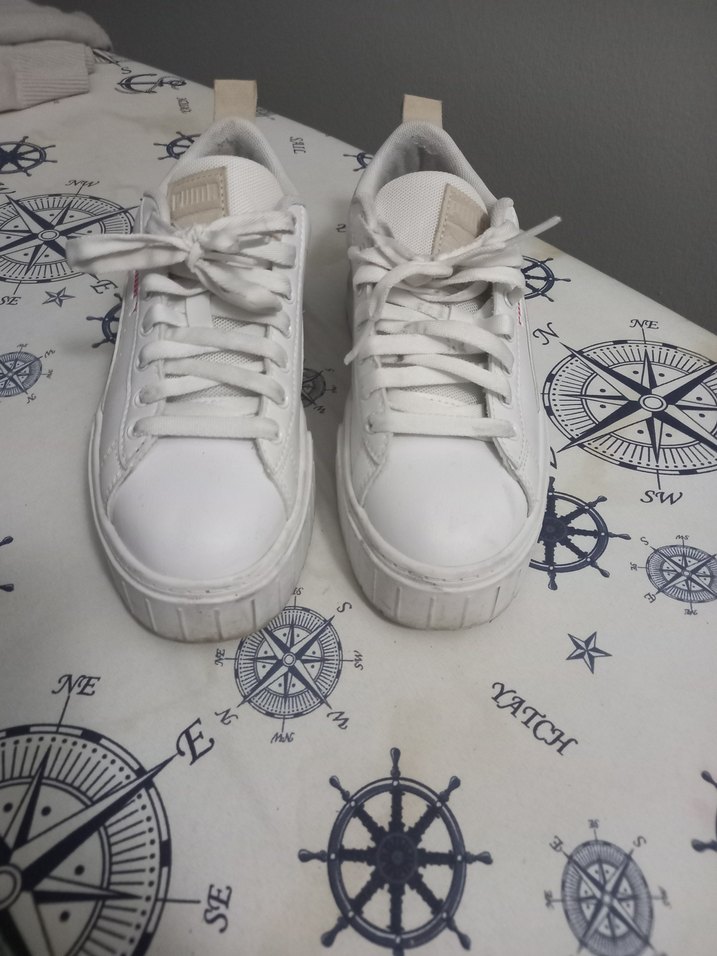 Beyaz platform topuklu, bağcıklı, kauçuk malzemeden yapılmış, desensiz günlük kullanıma uygun spor ayakkabılar. Pastel tonuyla sokak stiline uyum sağlar. ️orjinal puma spor ayakkabisi bir kac kez giyildi kusursuzdur ve temizdir.37 numara