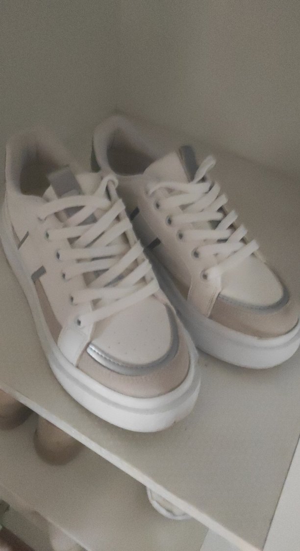 Gri detaylı beyaz platform topuklu bağcıklı kadın spor ayakkabısı, kauçuk tabanlıdır. Günlük sokak stiline uygundur. bir kez giyildi küçük geldiği için satışta