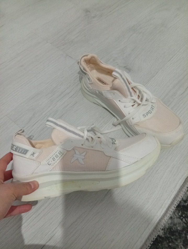 Beyaz platform topuklu, bağcıklı ve baskılı detaylara sahip spor ayakkabılar. Kauçuk tabanlı, sokak stili ve spor için uygundur.