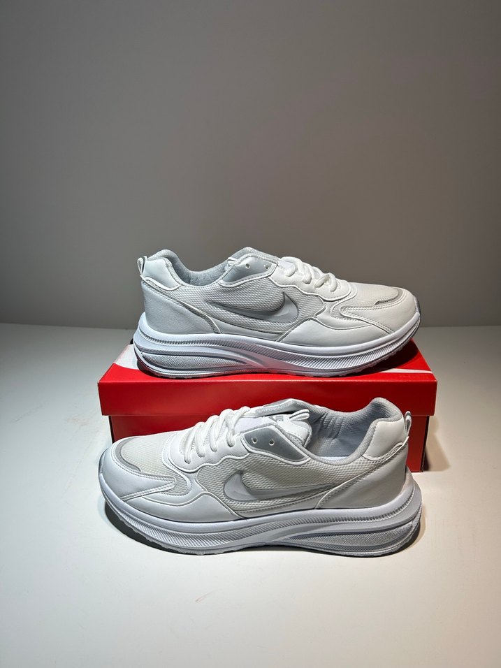 Beyaz platform topuklu erkek spor ayakkabısı, kauçuk malzemeden. Athleisure ve sokak stiline uygun, desensiz ve sade tasarım. Spor aktiviteleri için ideal. 40-45numara arası eşi