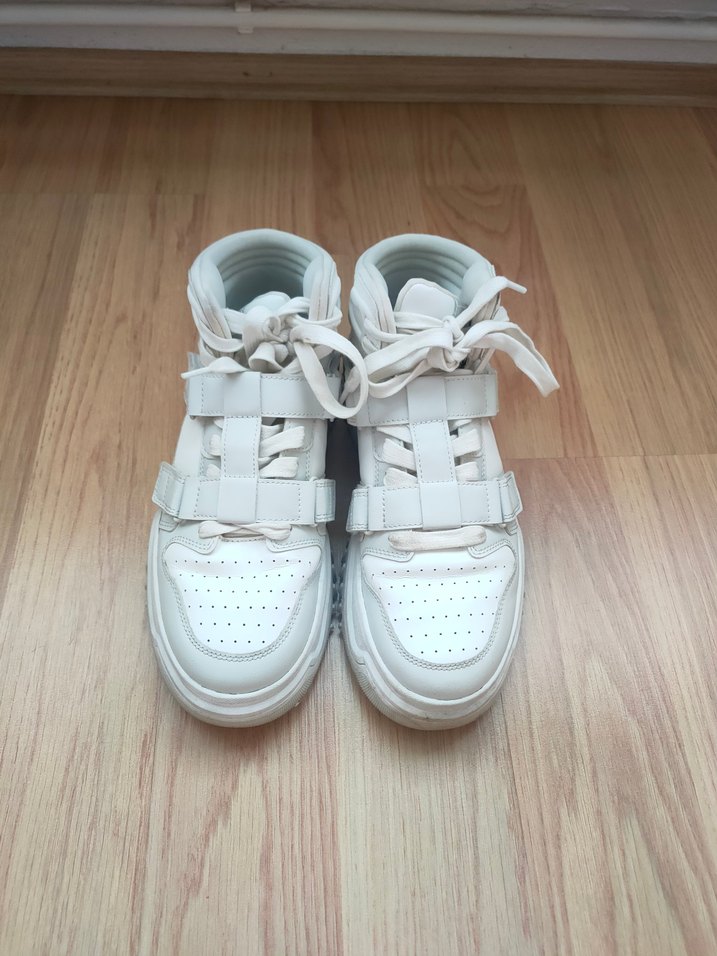 Beyaz renkte, platform topuklu ve tokalı bantlı erkek spor ayakkabısı. Kauçuk malzemeden üretilmiştir, sportif ve gündelik sokak stili için uygundur.