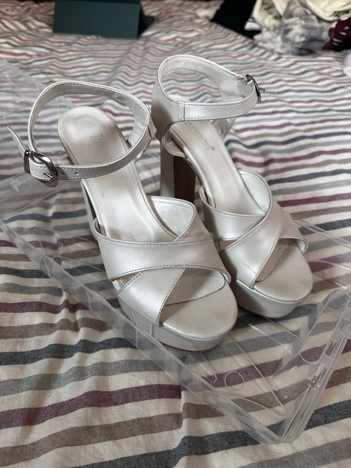 Beyaz, saten görünümlü, tokalı bantlara sahip platform topuklu ayakkabı 1 kez nikahımda giydim. Karınca ayakkabı mağazasından alındı. 13cm topuklu. Çok rahat bir ayakkabı. 37.5ayaga da olur