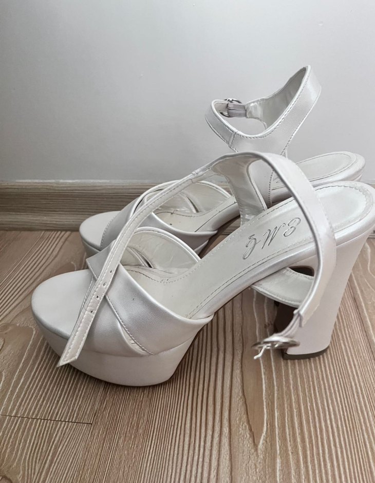 Beyaz platform topuklu, tokalı kadın abiye ayakkabı. Sadece düğünümde 3-4 saat kullanıldı. 13 cm topuk ancak aşırı rahat. Ayagımı hiç yormadı. Sürekli ayakta durmama rağmen ayağımda yok gibiydi. Muadilleri ile karıştırmayınız. Ayak ucunu sıkma, tabanı yorma gibi bir sorun asla yaratmıyor. 39 numara ancak 38.5 giyenlerde tercih edebilir. 2000 tl ye almıştım.