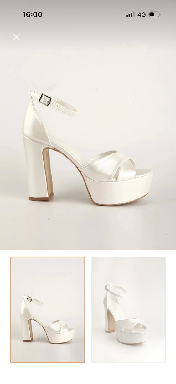 Beyaz platform topuklu ayakkabılar, parlak ve satenimsi dokuda, tokalı bilek kayışıyla. Minimalist ve desensiz tasarımı, çağdaş ve klasik zarafet için düğünlere uygun.