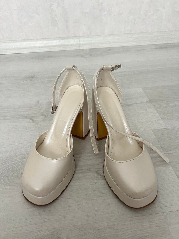 Beyaz platform topuklu kadın abiye ayakkabılar, tokalı kayış ve modern klasik tasarıma sahiptir. Yumuşak kauçuk malzemeden yapılmıştır, düğün ve minimal stiller için uygundur.