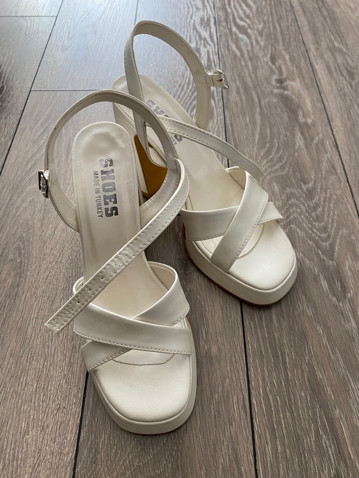 Beyaz renkli, tokalı kayışlara sahip platform topuklu kadın abiye ayakkabı. Minimalist ve şık tasarıma sahip, düğünler için uygun.