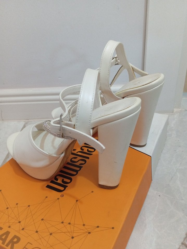 Beyaz renkte, tokalı platform topuklu kadın abiye ayakkabıdır. Minimalist ve baskılı desene sahip, düğün için uygundur.
