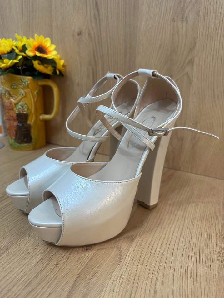 Bu beyaz platform topuklu ayakkabılar, tokalı bant ve minimalist tasarıma sahip, yumuşak kauçuk malzemeden üretilmiştir. Düğünler için klasik zarafet sunar.