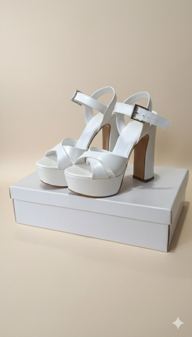 (34 numara) Beyaz, tokalı bantları olan platform topuklu abiye ayakkabı. Kauçuk malzemeden, minimalist ve çağdaş tasarım, düğünler için uygun. Gelin ayakkabısı 34 numaradır 16.5 cm topuk boyu altında isim yaziyo ama çıkar bir kere giyildi