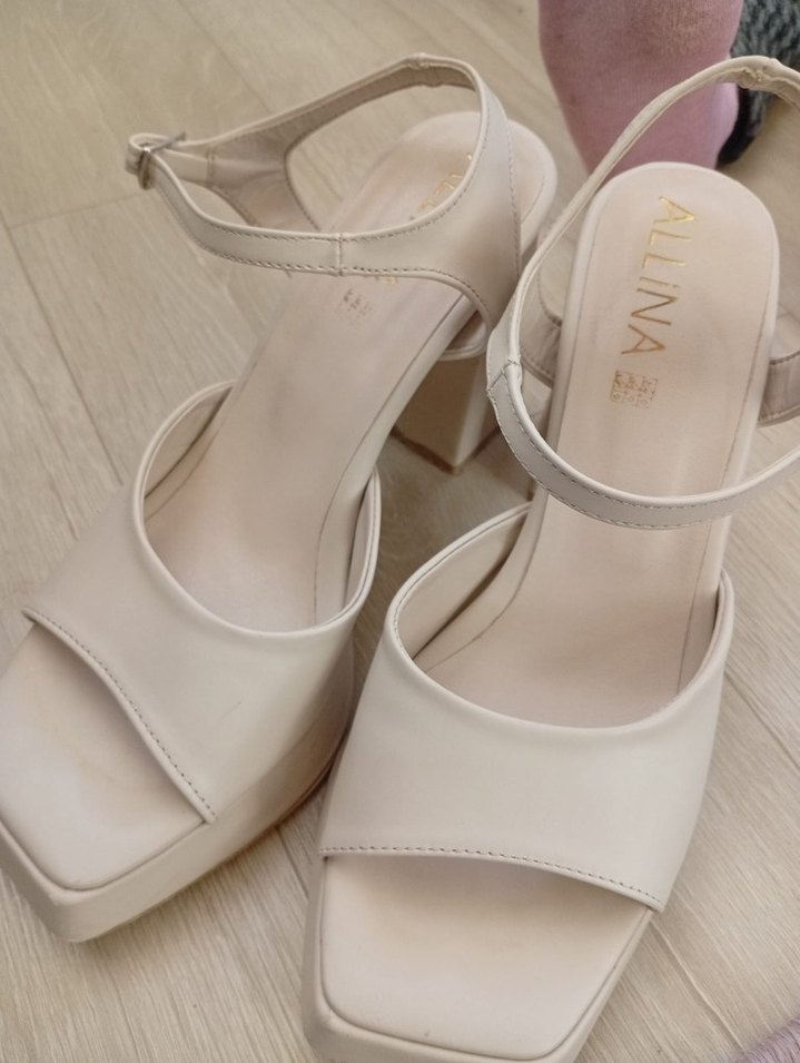 Minimalist beyaz platform topuklu ayakkabılar, tokalı bilek kayışıyla şıklık sunar. Düğün ve özel günler için uygundur. Marka ALLINA. bir defa kullanıldı. defosu yoktur.