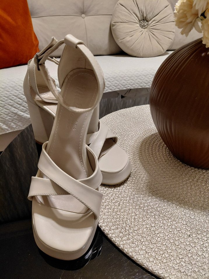 Beyaz platform topuklu, tokalı kayışlı kadın akşam ayakkabısı, minimalist ve çağdaş tasarıma sahip, günlük kullanıma uygun.