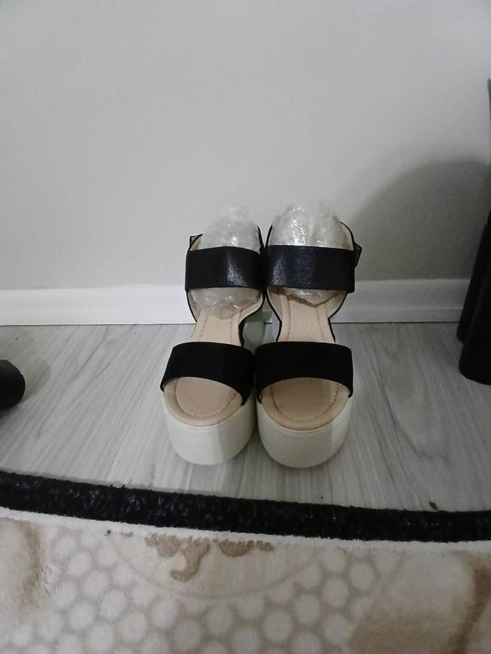 Beyaz platform topuklu kadın ayakkabı, siyah tokalı bantlarla, kauçuk tabanlı, minimalist ve çağdaş tasarıma sahip, günlük kullanıma uygun.