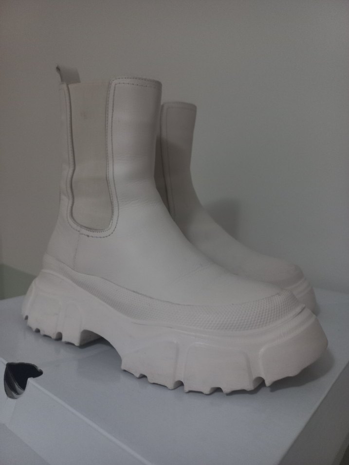 Beyaz platform topuklu, kauçuk malzemeden üretilmiş, sokak stili ve trend günlük kombinlere uygun deseniz botlar. Günlük kullanım için zahmetsiz şıklık sunar. Daykman markadir 1 hafta kullanılmıştır 38 numaradır.