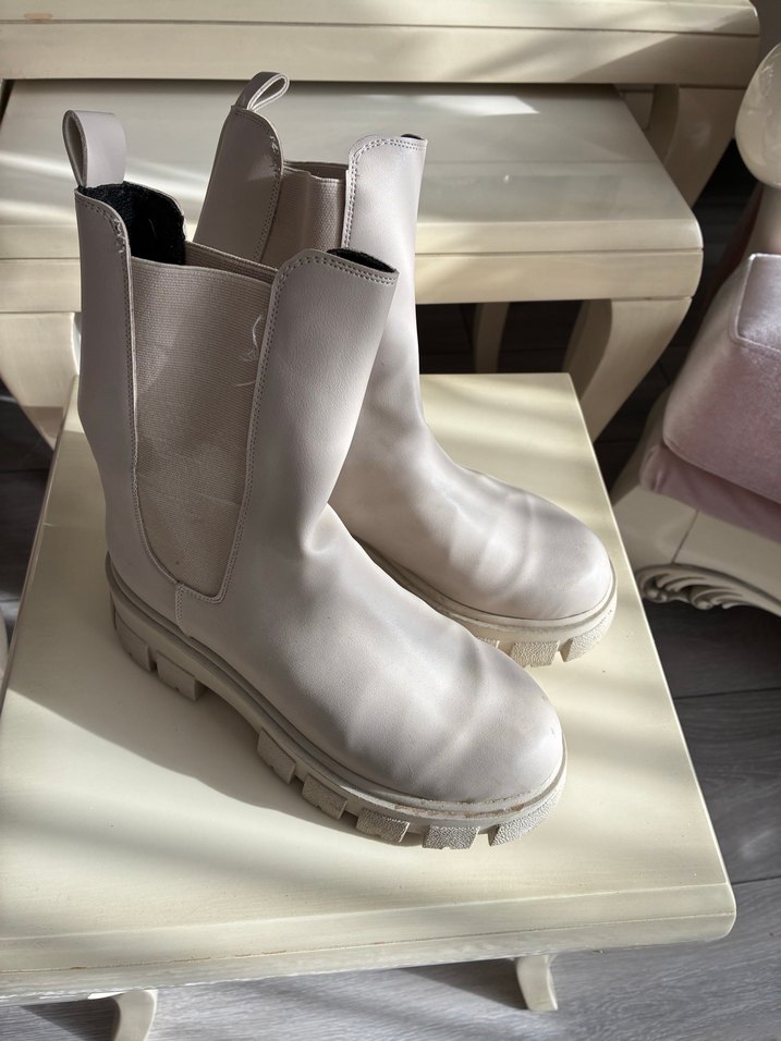Beyaz platform topuklu, kauçuk malzemeden üretilmiş kadın botları. Desensiz tasarımıyla gündelik kullanıma uygun, trend sokak stili ve zahmetsiz şıklık sunar.