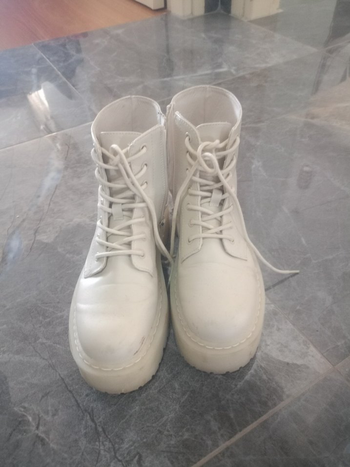 Beyaz platform topuklu, bağcıklı kauçuk botlar. Düz yüzeyli, hafif renk tonuyla günlük kullanıma uygun, rahat ve şık sokak stili ayakkabı. sayılı giyildi 2 yada 3 kez