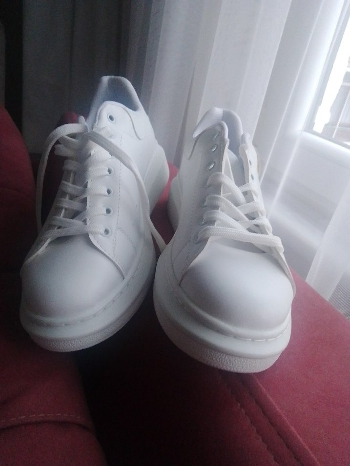 Beyaz platform topuklu kadın spor ayakkabısı, kauçuk malzemeden, sade ve desensiz tasarımla günlük sokak stili için rahat ve şık.