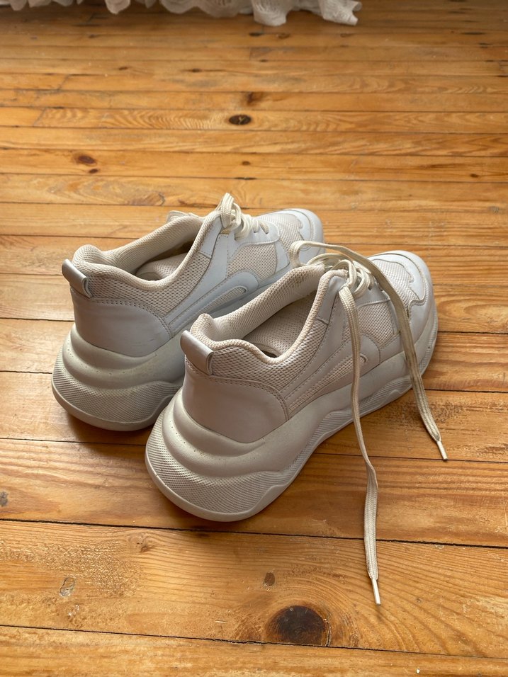 Beyaz, platform topuklu kadın spor ayakkabısı. Düz, desensiz tasarımı ve kauçuk malzemesiyle spor ve sokak stiline uygundur.
