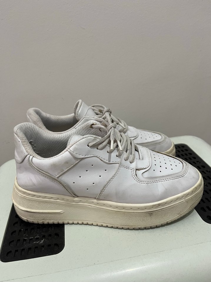Beyaz, platform topuklu, kauçuk malzemeden yapılmış kadın spor ayakkabısı. Düz ve desensiz, rahat sokak stili ve spor için uygundur. Yıkanıp gönderilecektir