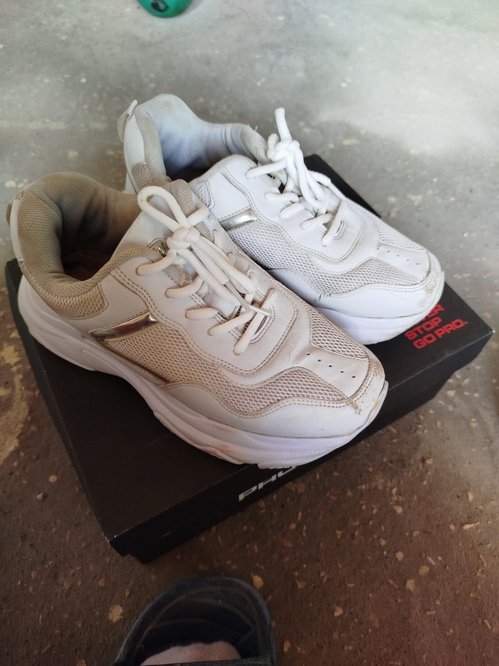 Beyaz platform topuklu kadın spor ayakkabısı, bağcıklı ve gri detaylı, kauçuk tabanlıdır. Spor ve sokak stili için uygundur.