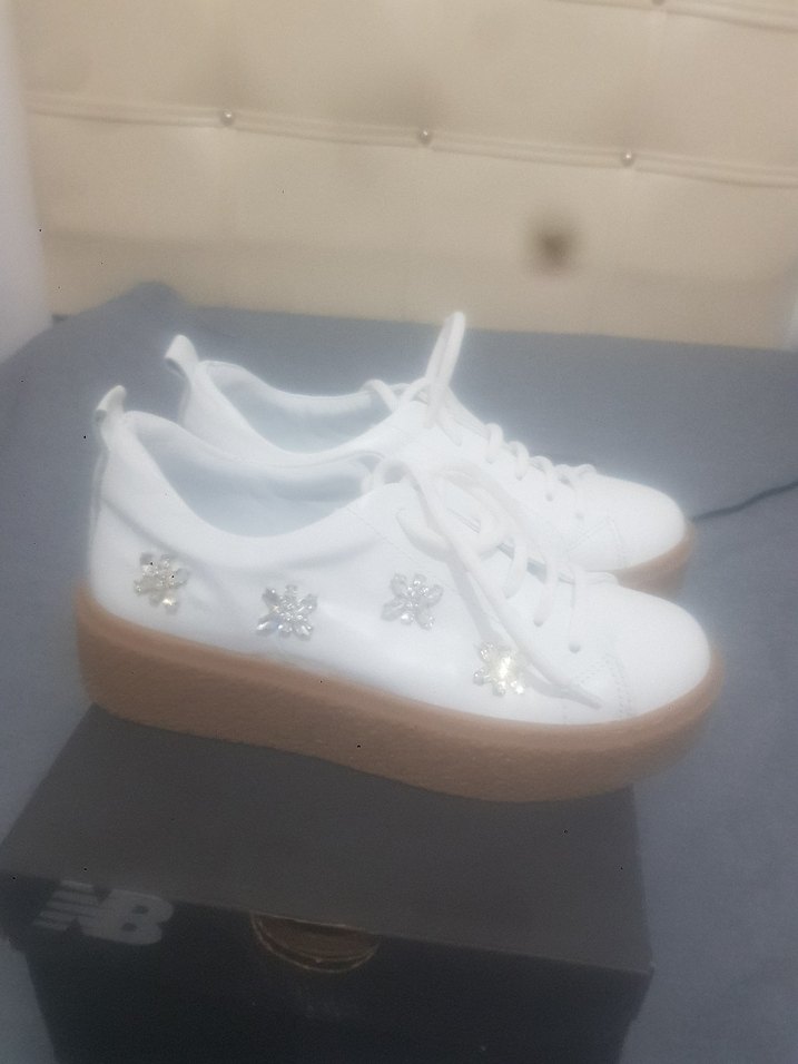 Beyaz platform topuklu kadın spor ayakkabı, çiçek desenli payet detaylı ve kauçuk tabanlı, günlük sokak stiline uygun.