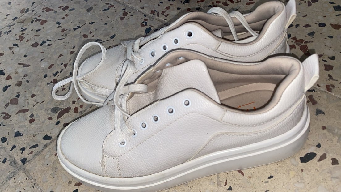 Beyaz, platform topuklu ve kauçuk tabanlı kadın spor ayakkabısı. Sokak stiline uygun, desen içermeyen günlük kullanım için ideal.