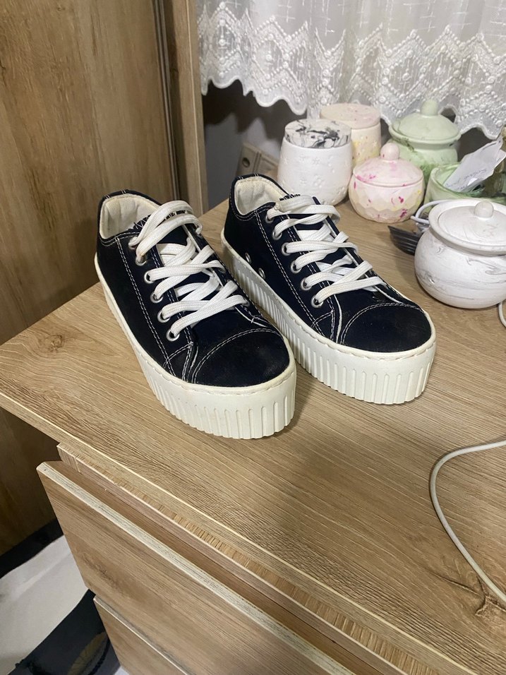 Beyaz platform topuklu kadın spor ayakkabılar, minimalist sokak stili ve kauçuk malzemeden yapılmıştır. Günlük kullanım için zahmetsiz şıklık sunar. Ürün hiç kullanılmamıştır durmaktan sararan yerler resimde göründüğü gibi