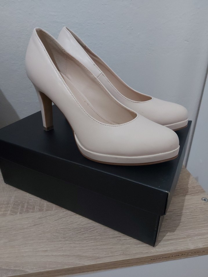 Beyaz platform topuklu, desen içermeyen kauçuk malzemeden yapılmış kadın stiletto. Gelinliğin altına 1 kez kullandım 39 numara cok rahat bir ayakkabı. Deichmann dan alındı