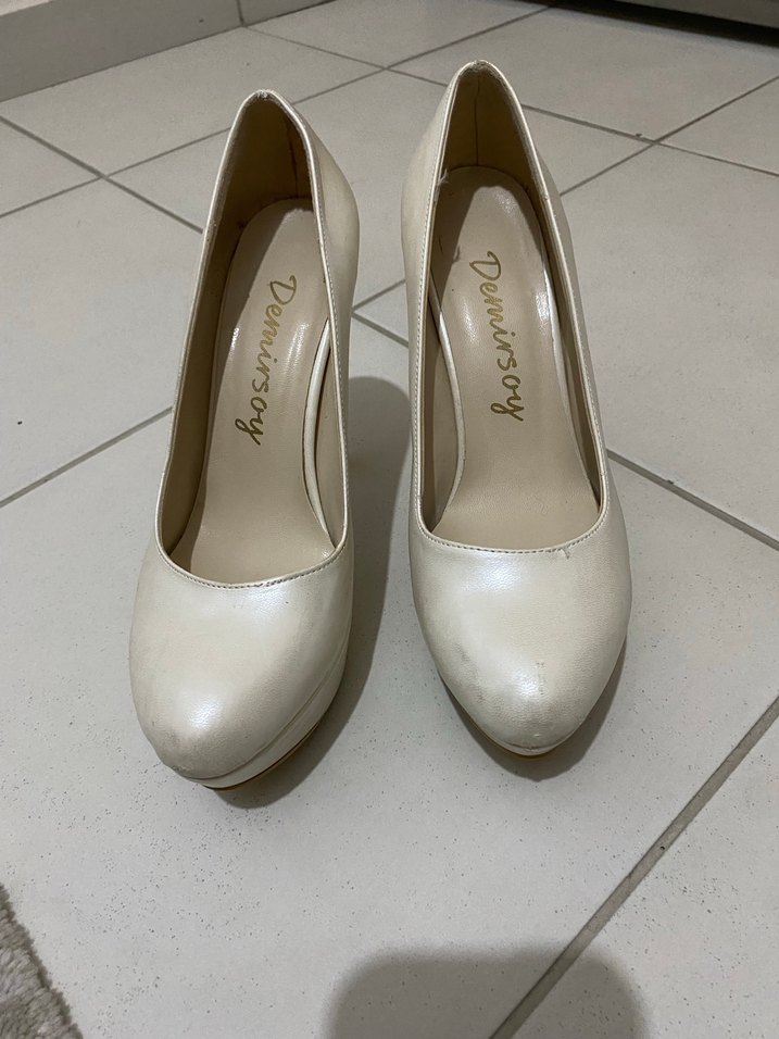 Beyaz platform topuklu, minimalist ve modern klasik tasarıma sahip kadın stiletto. Kauçuk malzemeden üretilmiş, düğünler için zahmetsiz şıklık sunar. Marka: Demirsoy.