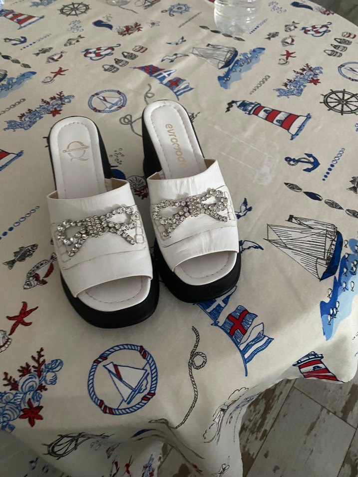 Beyaz platform topuklu, tokalı ve nakışlı parlak detaylara sahip kauçuk kadın terlikleri. Gotik tarzı Paris esintisiyle birleştirir, trend günlük kullanım için uygundur. Marka temsılıdır unlu markaların numunelerıdır ıc dış derı
