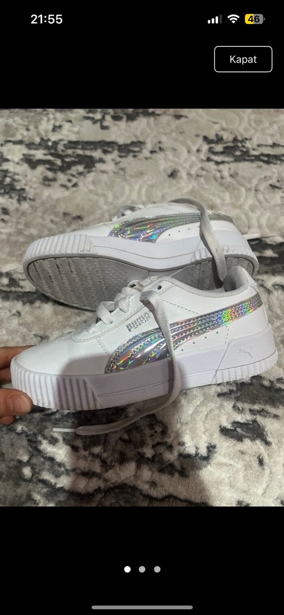Beyaz Puma spor ayakkabılar, platform topuk ve cırt cırtlı bant içerir. Yanlarda hafif tie-dye desen vardır. Kauçuk tabanlı, günlük kullanıma uygundur.