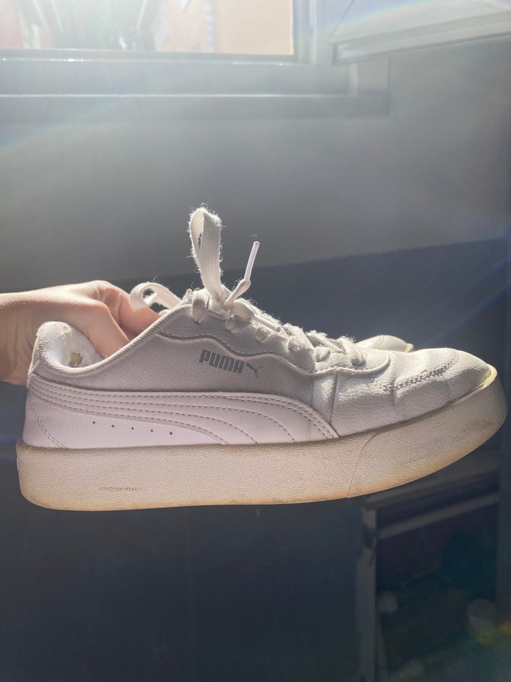 Beyaz platform topuklu Puma spor ayakkabısı, kauçuk malzemeden üretilmiş, spor ve sokak stiline uygun rahat ve şık bir tasarım. gözüktüğü gibi