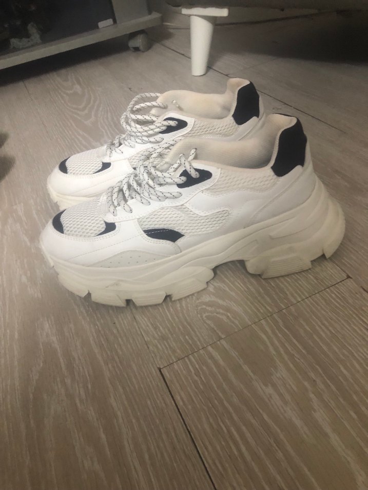 Beyaz platform topuklu, bağcıklı, kauçuk tabanlı, desensiz kadın spor ayakkabısı, sportif sokak stili için uygundur.