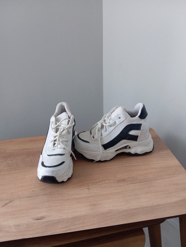 Beyaz ve siyah renkli, platform topuklu kadın spor ayakkabısı. Kauçuk tabanlı, rahat ve dayanıklı, spor ve sokak stiline uygun. 38 numara ama kalıbı biraz dar ben 37 giyiyorum oldu topuk dikenim ollduğu için kullanamıyorum 2 kez giyildi