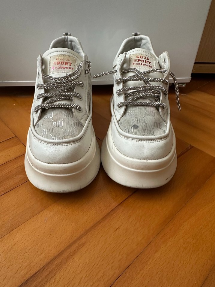 Gri baskılı detaylara sahip beyaz kadın spor ayakkabısı. Kauçuk tabanlı, platform topuklu ve günlük kullanıma uygun trend sokak stili.