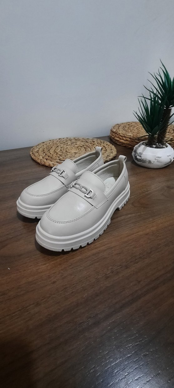 Beyaz renkli, tokalı ve platform topuklu çocuk loafer ayakkabılar. Kauçuk malzemeden, minimalist sokak stili için uygundur. sadece 1 kez giyindi bej rengi