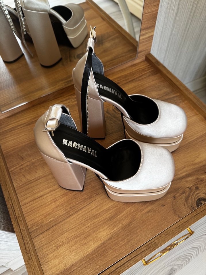 Beyaz platform topuklu, tokalı kayışlı, baskılı desene sahip bohem tarzda kadın abiye ayakkabı.düğün ve şık kombinler için uygun. Gelinliğimin altına giymek için almıştım ama hiç kullanmadım çok rahat bir ayakkabı