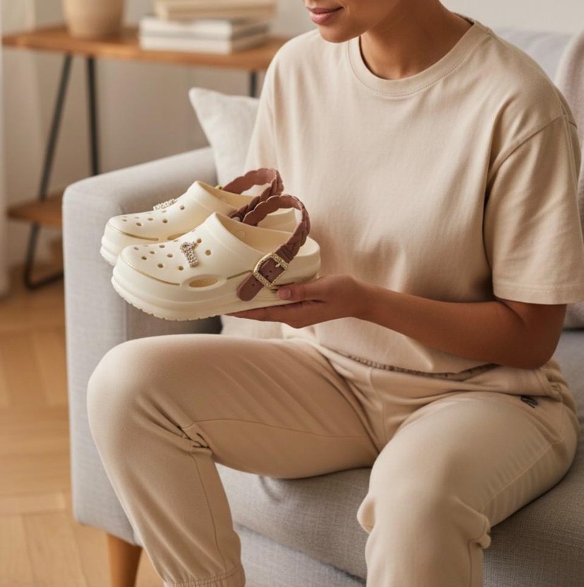 Beyaz renkte, tokalı kayışlı platform topuklu kadın terlik. Kauçuk malzemeden yapılmış, desen içermeyen rahat ve şık tasarım.