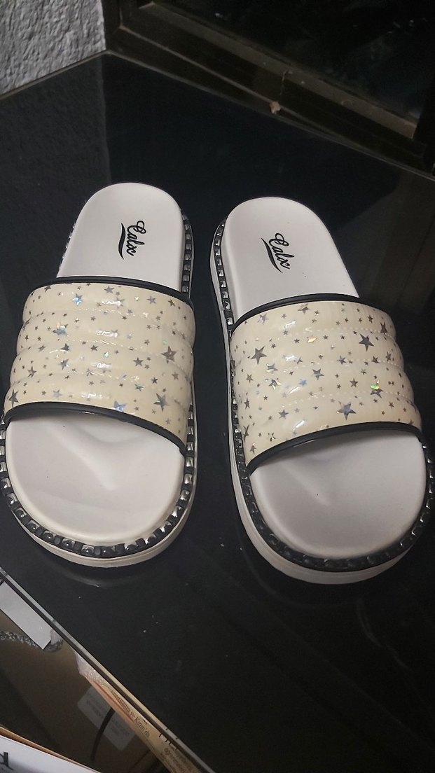 Beyaz platform taban kadın terlik, parlak yıldız desenli ve sim detaylı kayışa sahip, trend sokak stili için uygundur. sert tabanlıdır