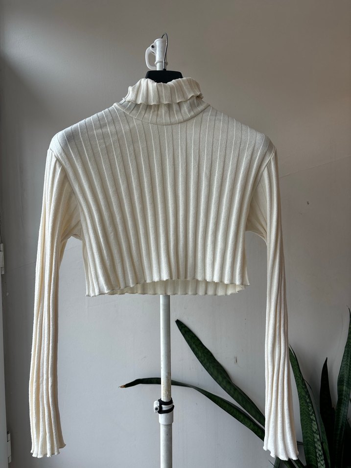 Beyaz örme kumaştan, uzun kollu ve fitted kesime sahip, pliseli boğazlı crop kazak. Minimalist ve şık bir sokak stili sunar. Günlük kullanıma uygundur.