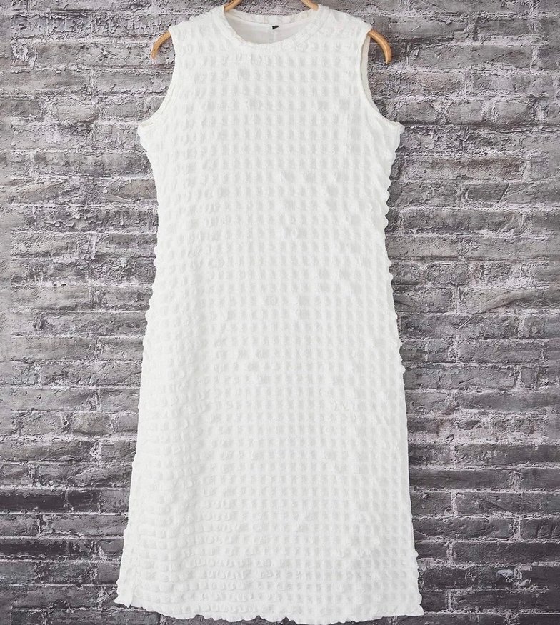 Beyaz Pliseli Kolsuz Midi Örme Elbise
