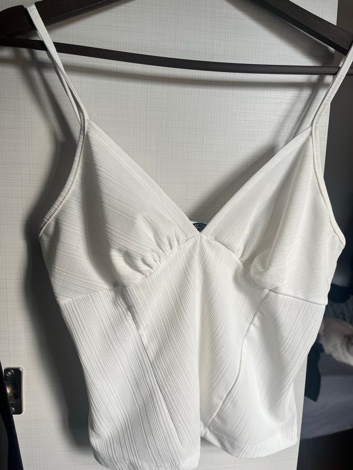 Beyaz renkli, ince askılı ve V yaka hiç giyilmedi etiketi yok içi belli ediyor