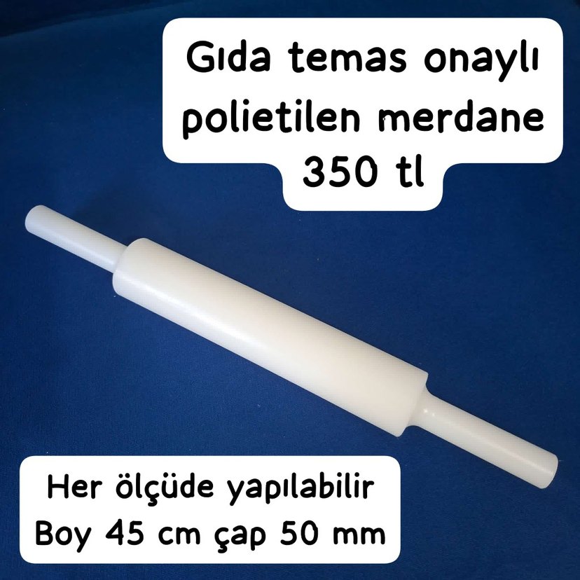Gıda temasına uygun beyaz polietilen merdane, 45 cm uzunluğunda ve 50 mm çapındadır. İstenilen ölçüde üretilebilir.