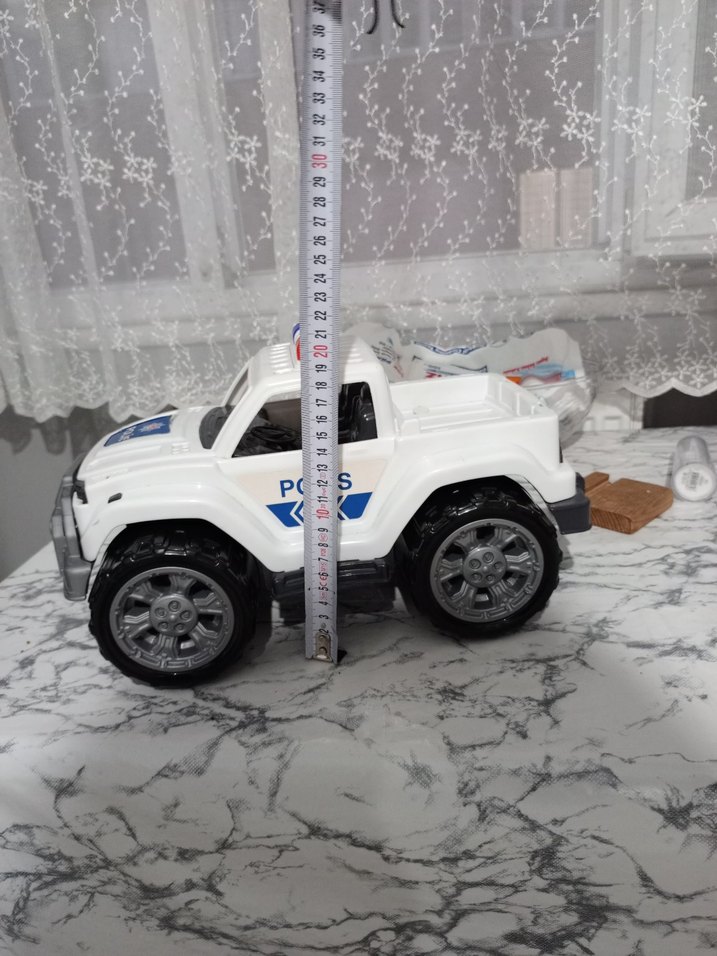Yaklaşık 20 cm yüksekliğinde, büyük siyah tekerlekli beyaz polis oyuncak arabası. Araç oyuncaklarını seven çocuklar için uygundur.
